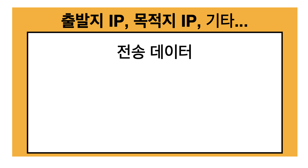 데이터 통신단위인 패킷에는 출발지 IP, 목적지 IP 및 기타 정보와 전송 데이터(예시: “Hello, world!”)가 담기게 된다.