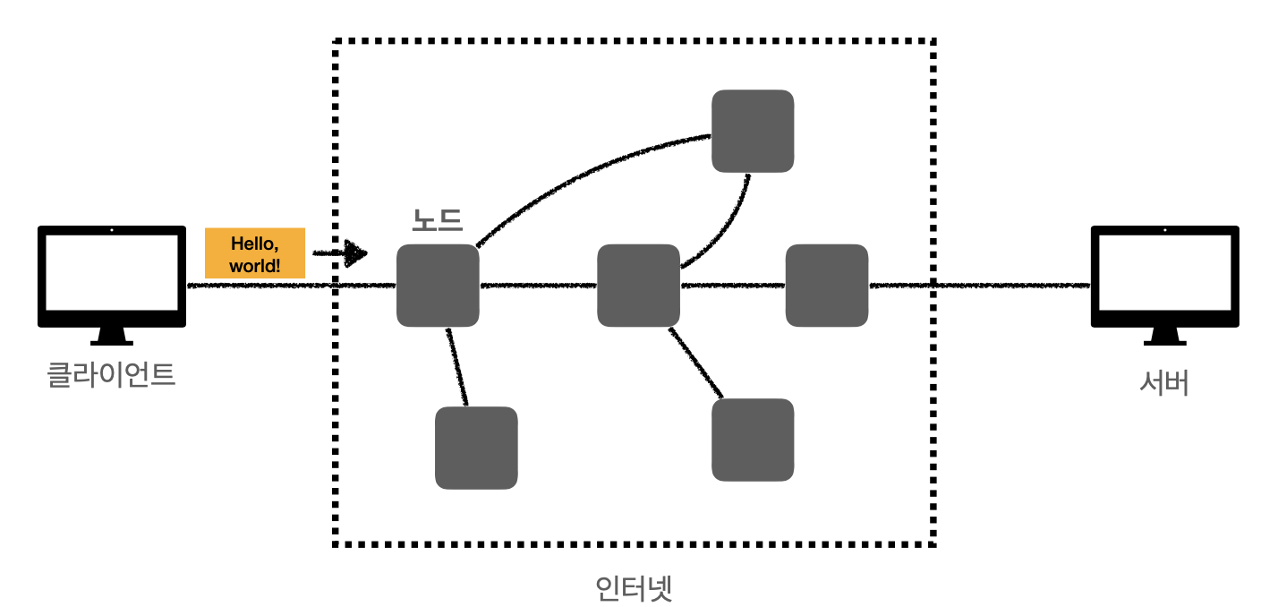 이렇게 담긴 패킷이 목적지 IP에 여러 노드(인터넷)를 거쳐 서버 컴퓨터에 도착하게 된다.