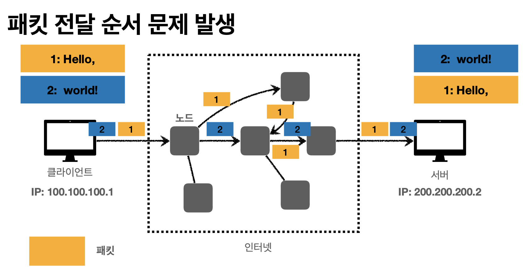 비신뢰성 : 중간에 패킷이 사라지거나 패킷이 순서대로 도착하지 않음..